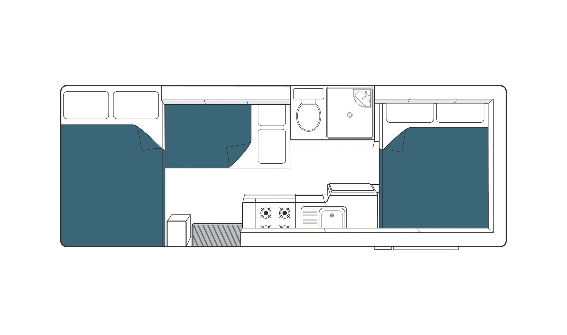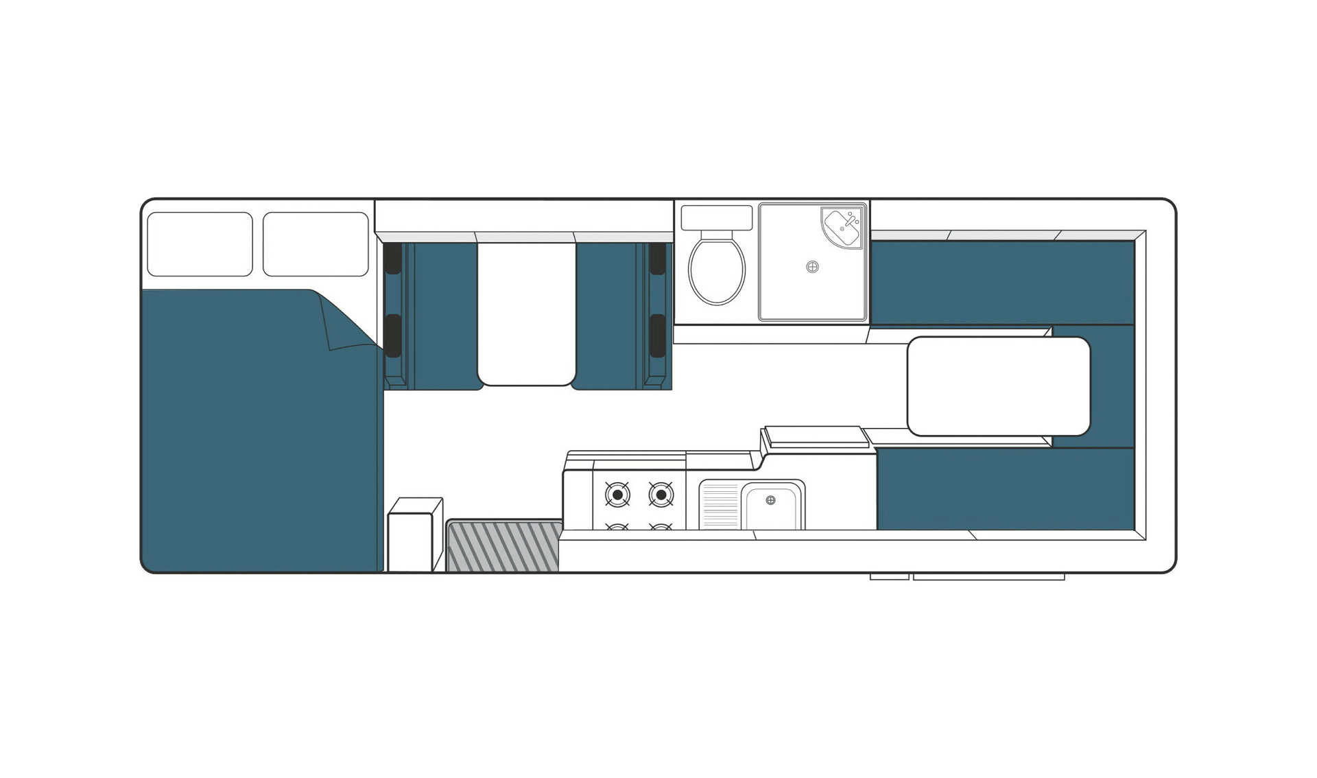 • Sitzgruppe im Heck, zum Doppelbett umbaubar 2,10 x 1,40 m